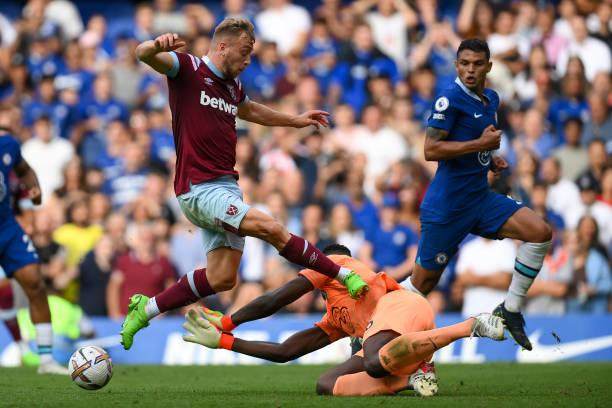 切尔西主帅图赫尔在周中赛后批评了球队的表现,并且声称会尽快找出解决方案。不过从周六蓝军开场的表现来看,德国教头明显还没理出什么头绪。整个上半场乏善可陈,而比赛刚过60分钟,切尔西就率先丢球:球队的定位球防守一塌糊涂,当安东尼奥补射空门的时候,爱德华·门迪和另外两名切尔西防守球员相撞,像叠罗汉一样尴尬地横卧在门线上,正在彼此挣扎。